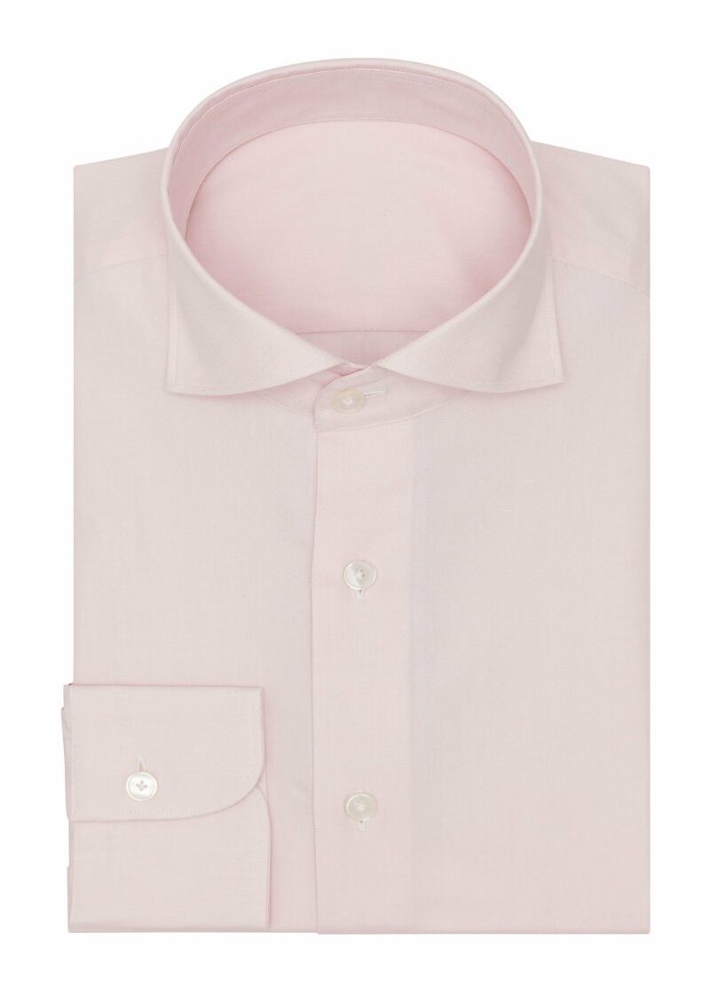 Spread collar, round single button cuff, mother of pearl buttons, long sleeve, removable collar stay, extra structured collar and cuff