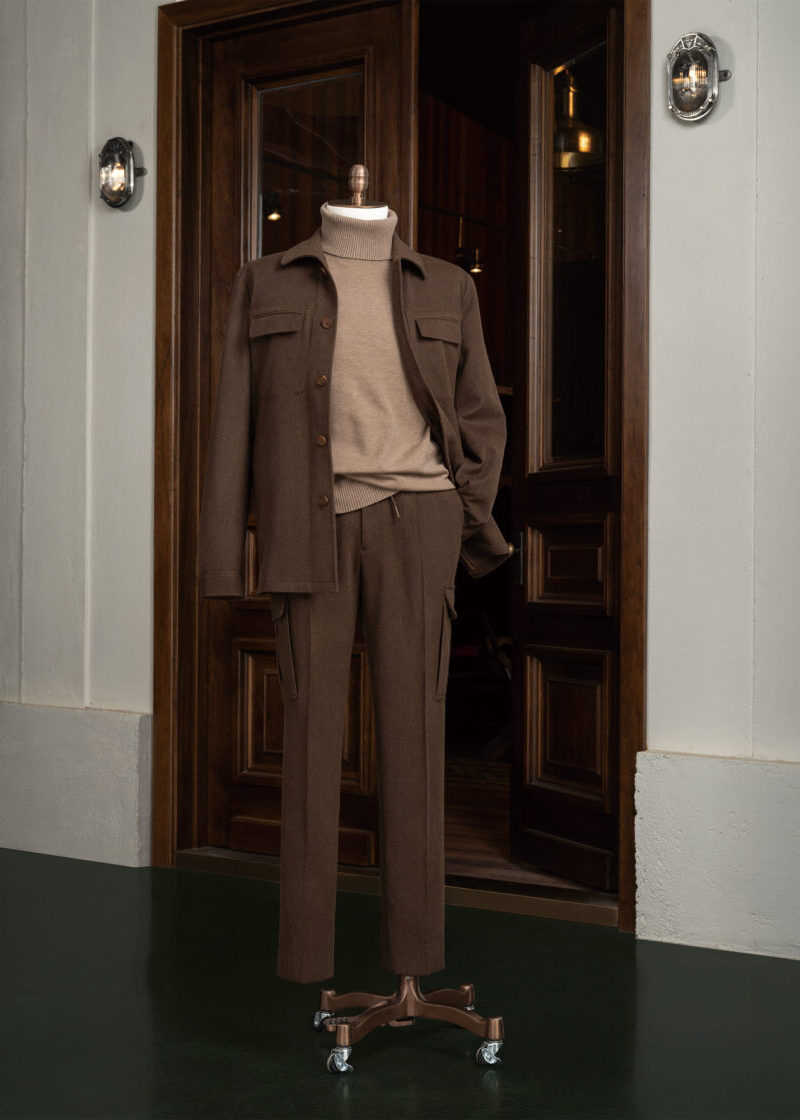 This versatile ensemble features a relaxed yet refined look, with a classic brown colour that complements any occasion. The drawstring pants, complete with cargo pockets, offer a convenient and modern twist on casual wear, ensuring both functionality and fashion.
