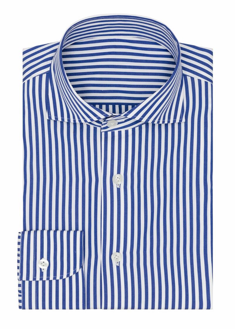 Spread collar, round single button cuff, mother of pearl buttons, long sleeve, removable collar stay, extra structured collar and cuff