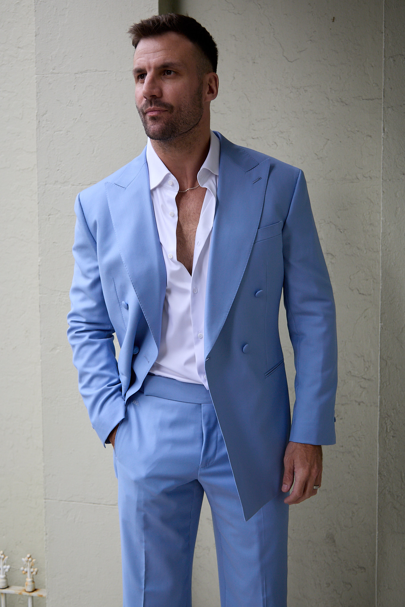 Soar to new heights of style with The Celestial Splash Suit. This sky-blue stunner brings a burst of fresh, airy charm to your wardrobe, like a brisk breeze on a perfect spring day.