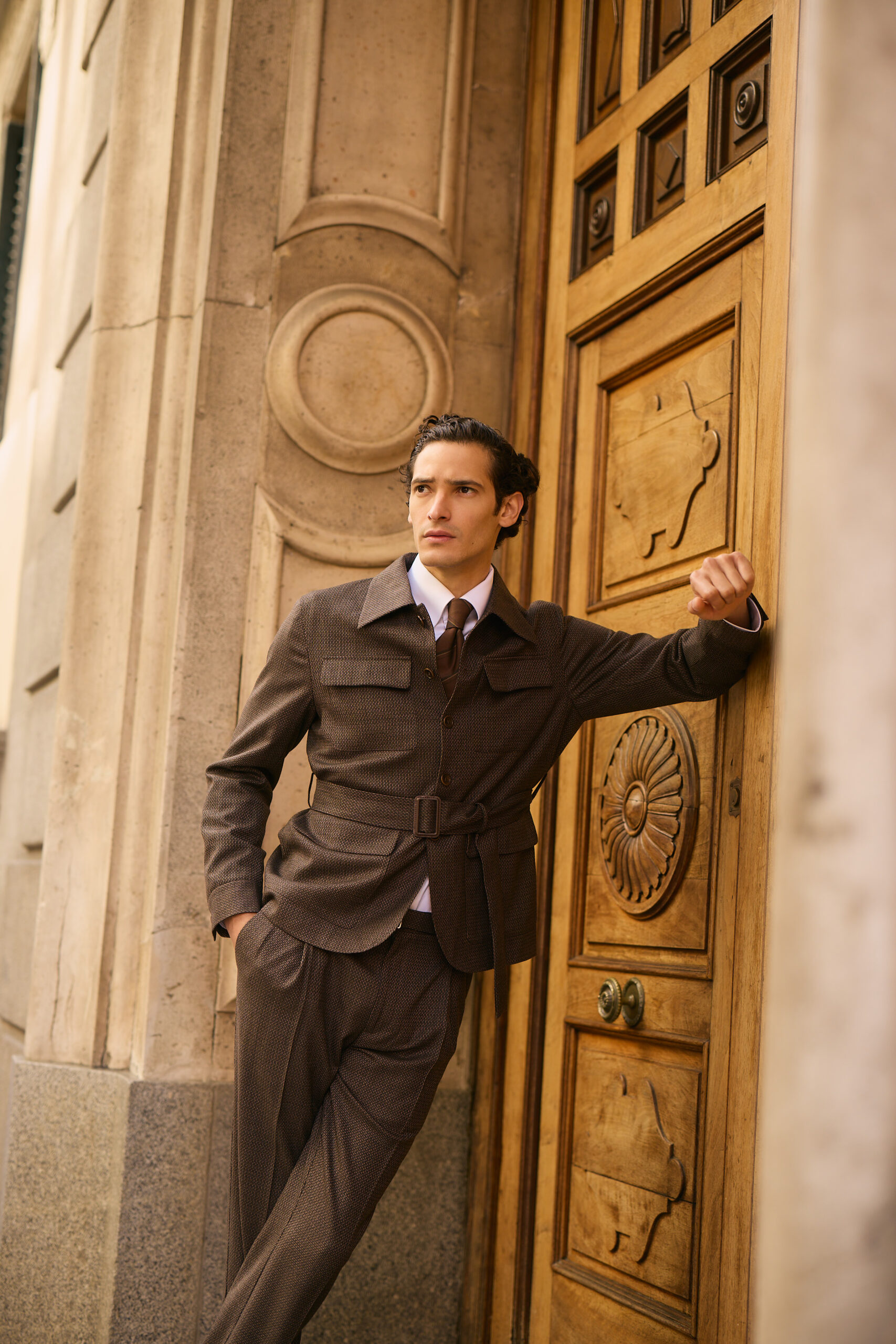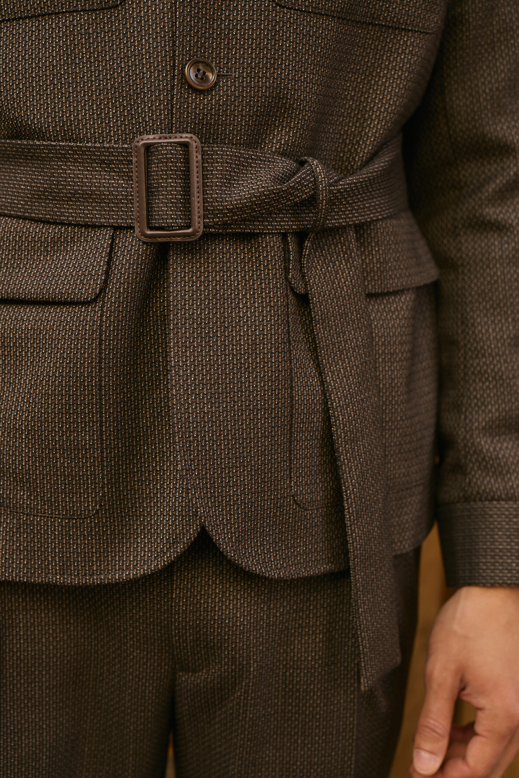 Elevate your relaxed wardrobe with the Hawthorne Set — a brown jacquard wool jacket paired with matching tailored pants. Subtle texture meets modern tailoring for a look that’s effortlessly refined, whether you’re enjoying weekend brunch or an evening out in the city.