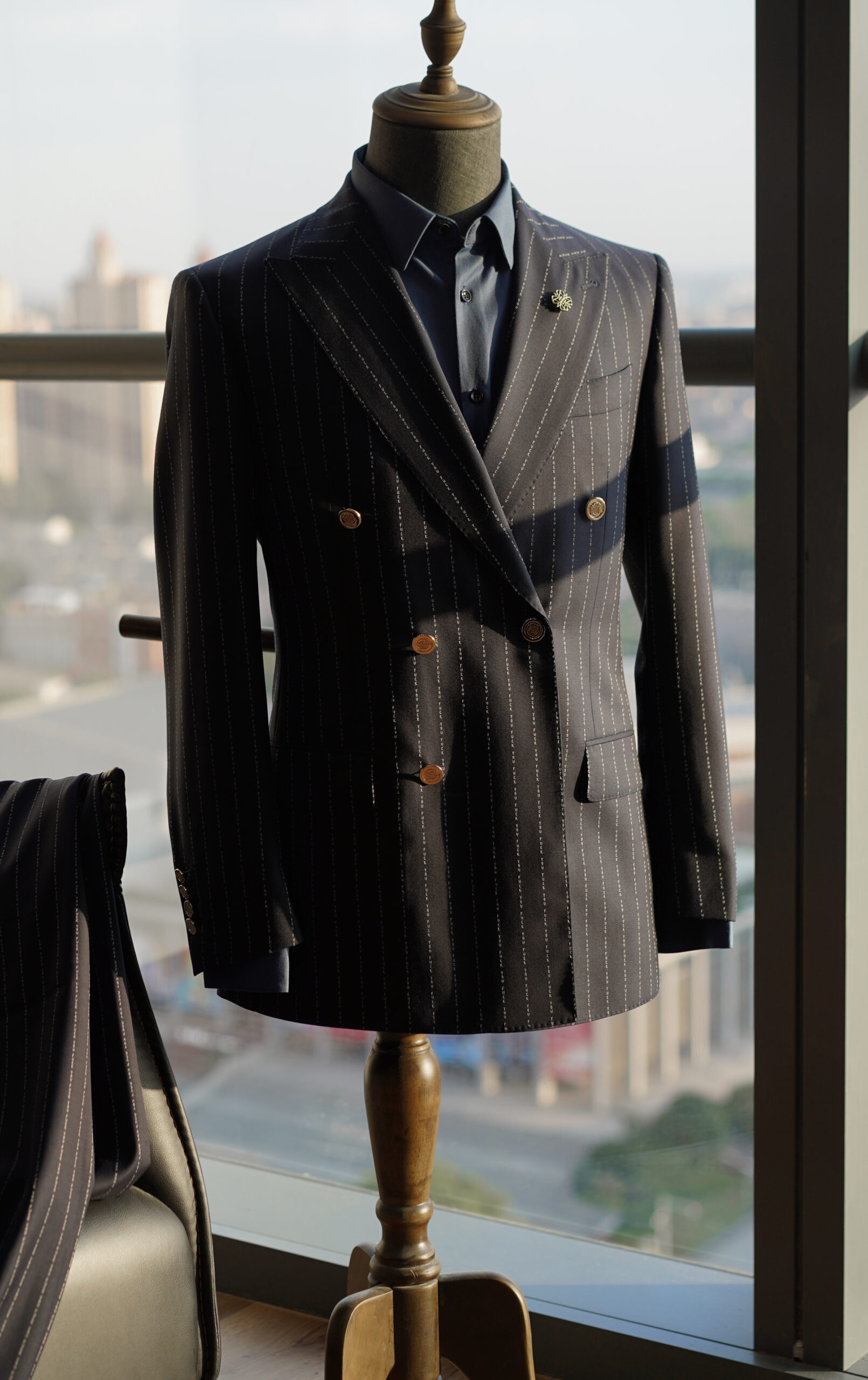 The navy suit that says exactly what it means: No Filter. Crafted with bold pinstripes that spell out a message for the world to read, this tailored fit brings the heat while maintaining classic sophistication.